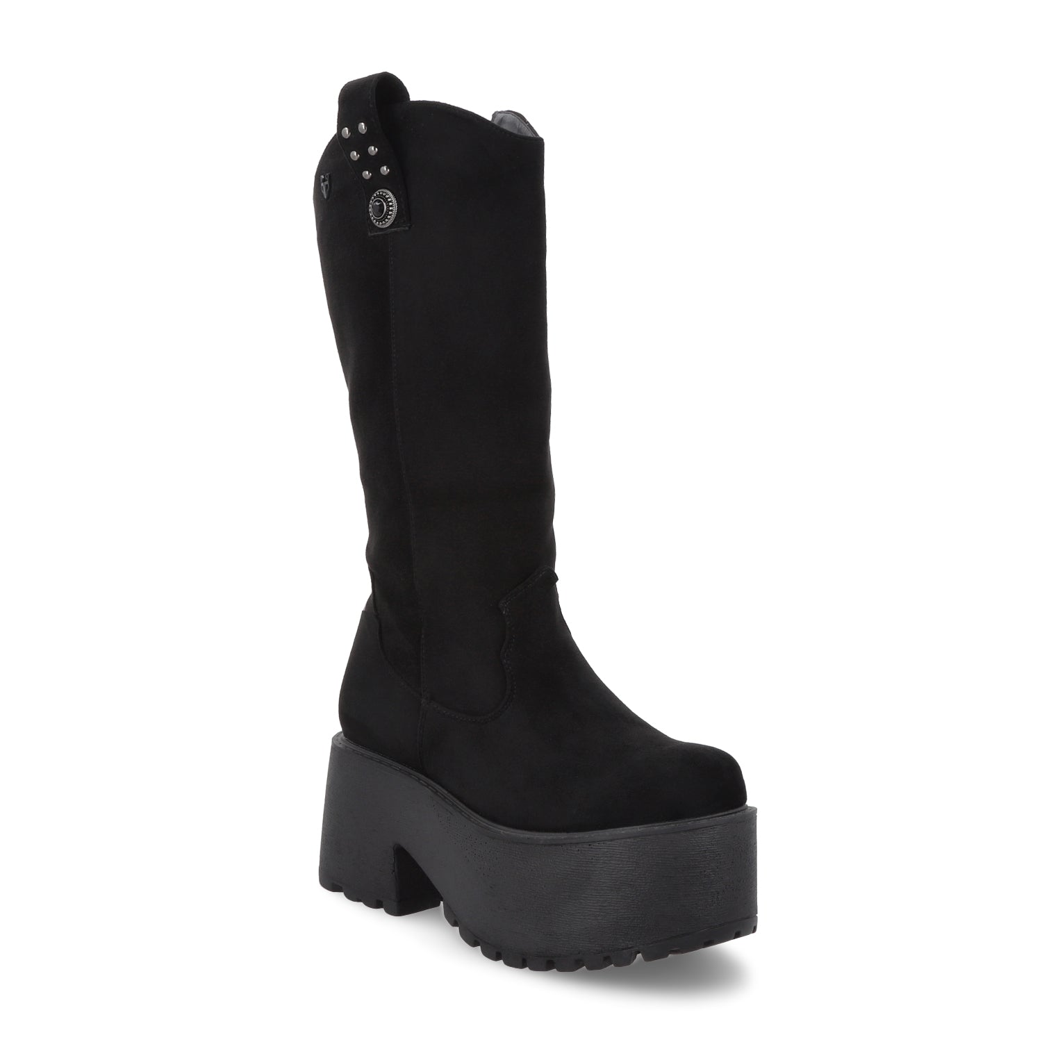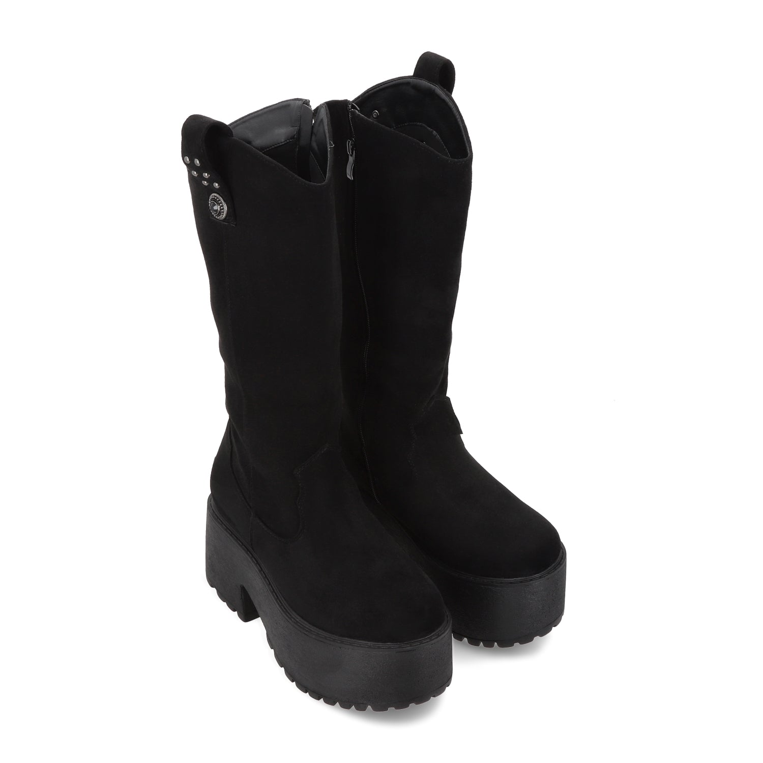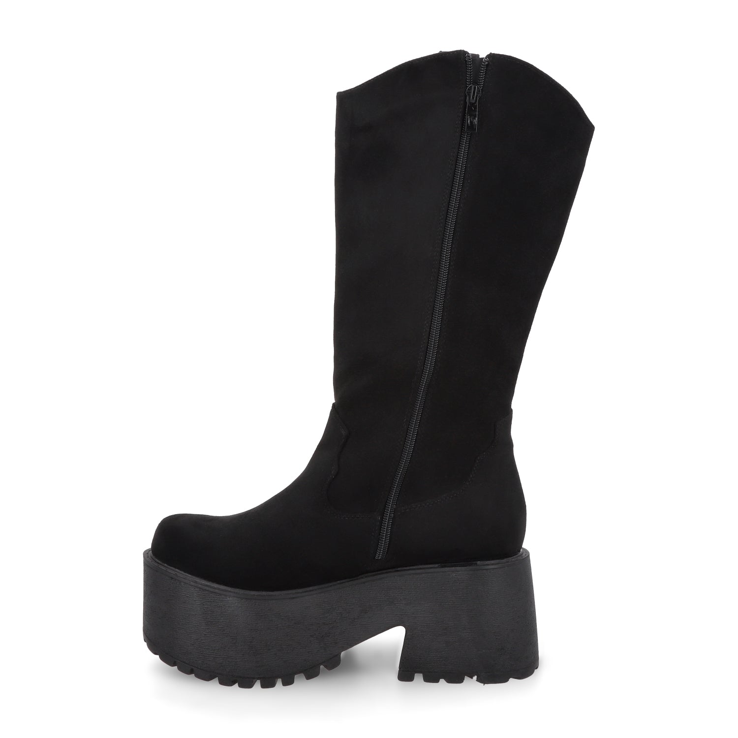 Imponente y con un aire trendy y urbano, esta bota negra de apariencia gamuza con plataforma es el calzado perfecto para quienes buscan un look audaz y sofisticado. Su diseño de caña alta estiliza la pierna, mientras que la plataforma gruesa añade altura y un toque vanguardista sin sacrificar comodidad.