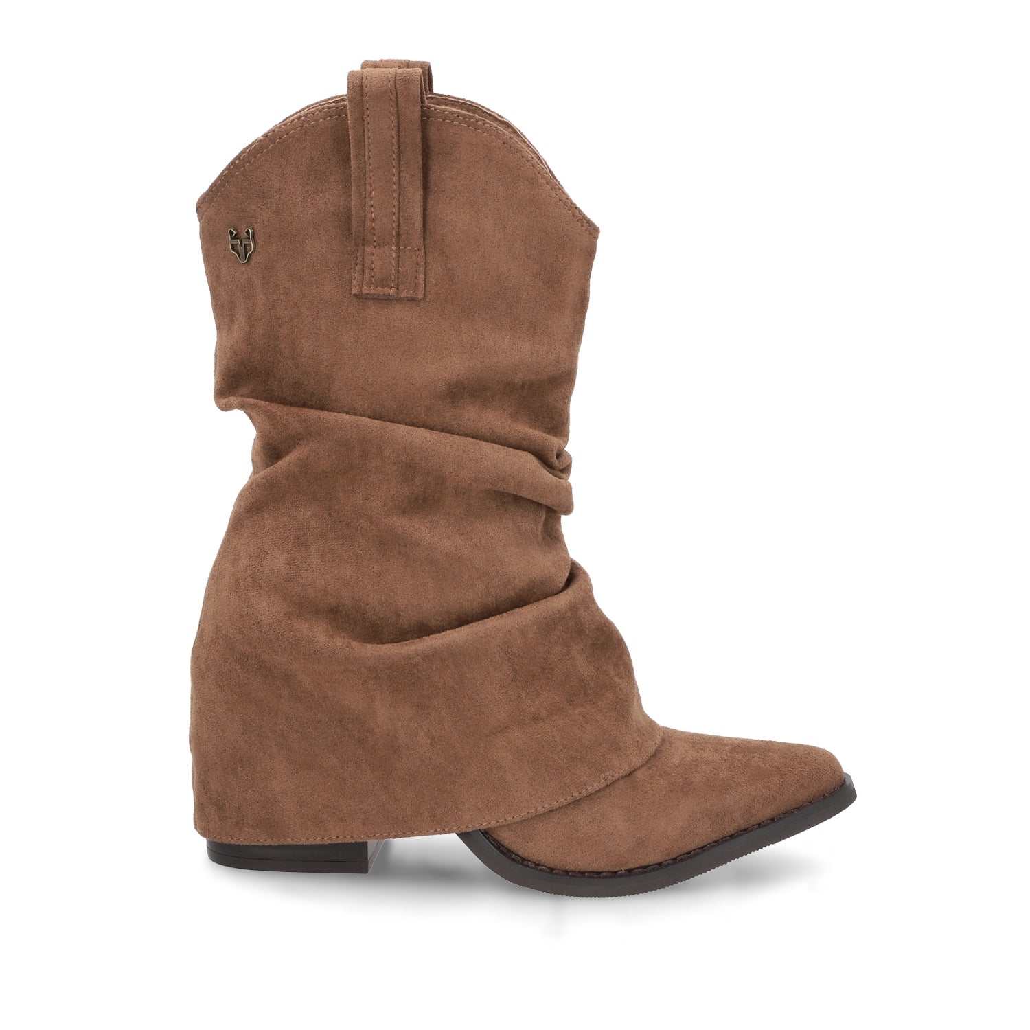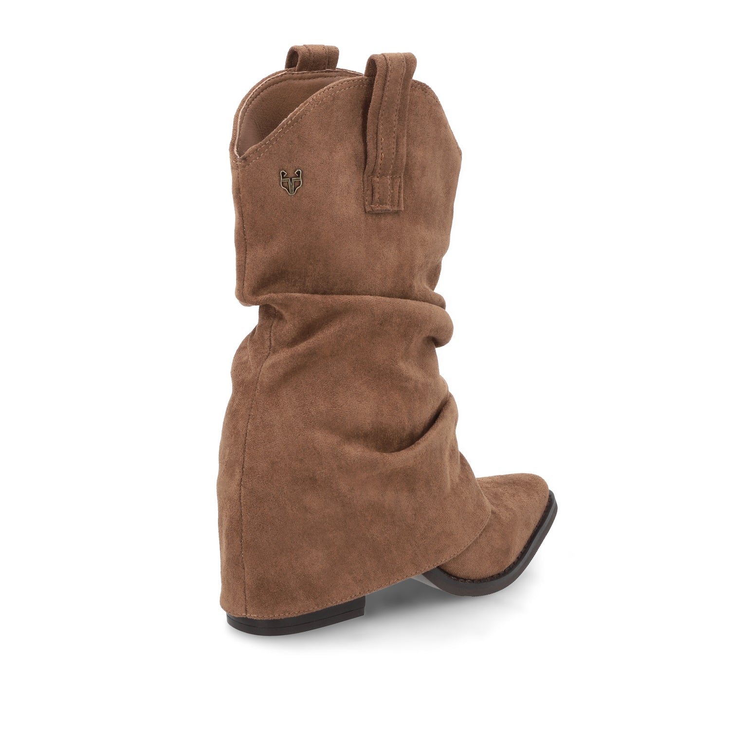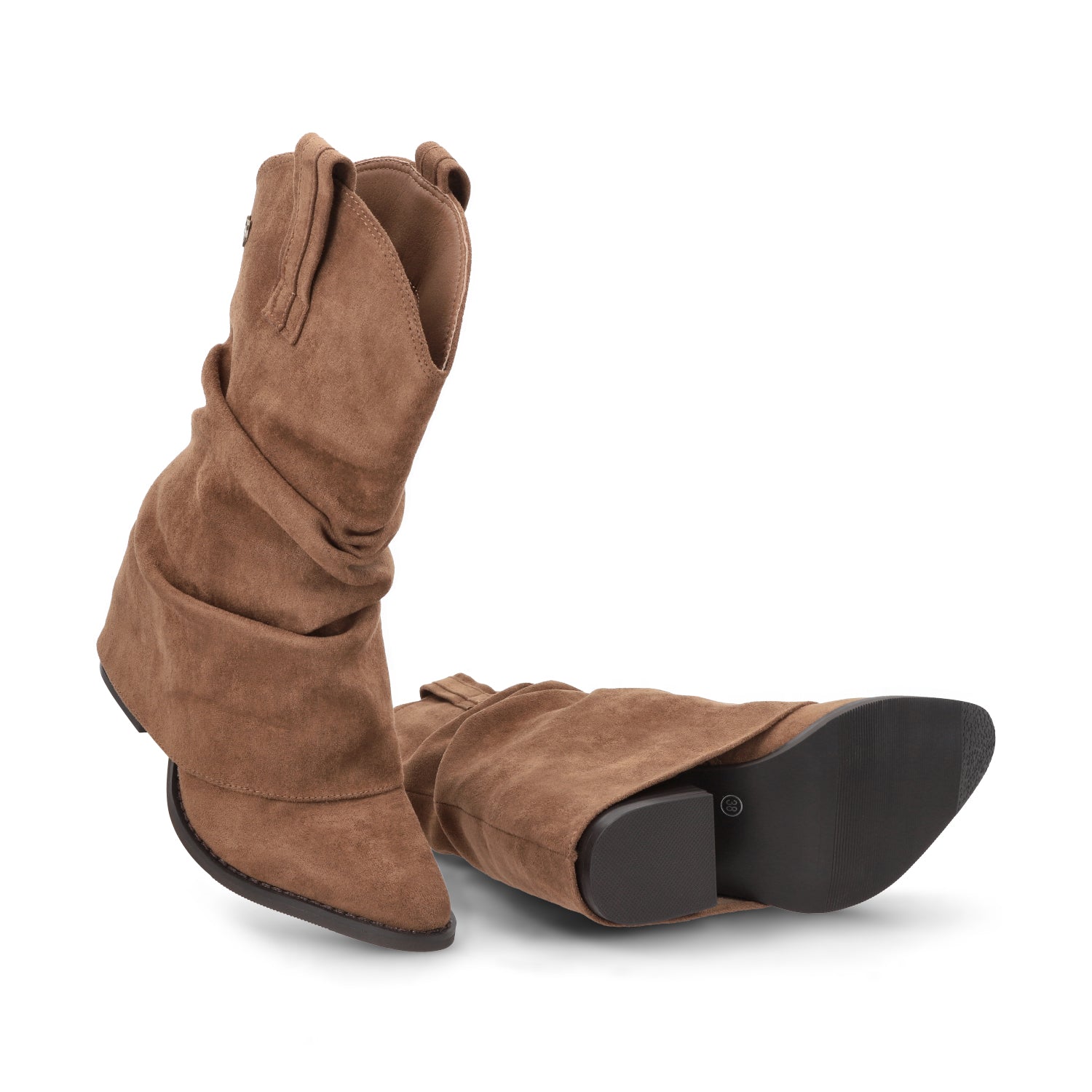 Las botas texanas siguen siendo el must-have de la temporada, y este modelo en gamuza café es la combinación perfecta de estilo rústico y tendencia urbana. Su tono cálido y versátil se adapta a cualquier outfit, aportando un aire boho-chic que no pasa desapercibido