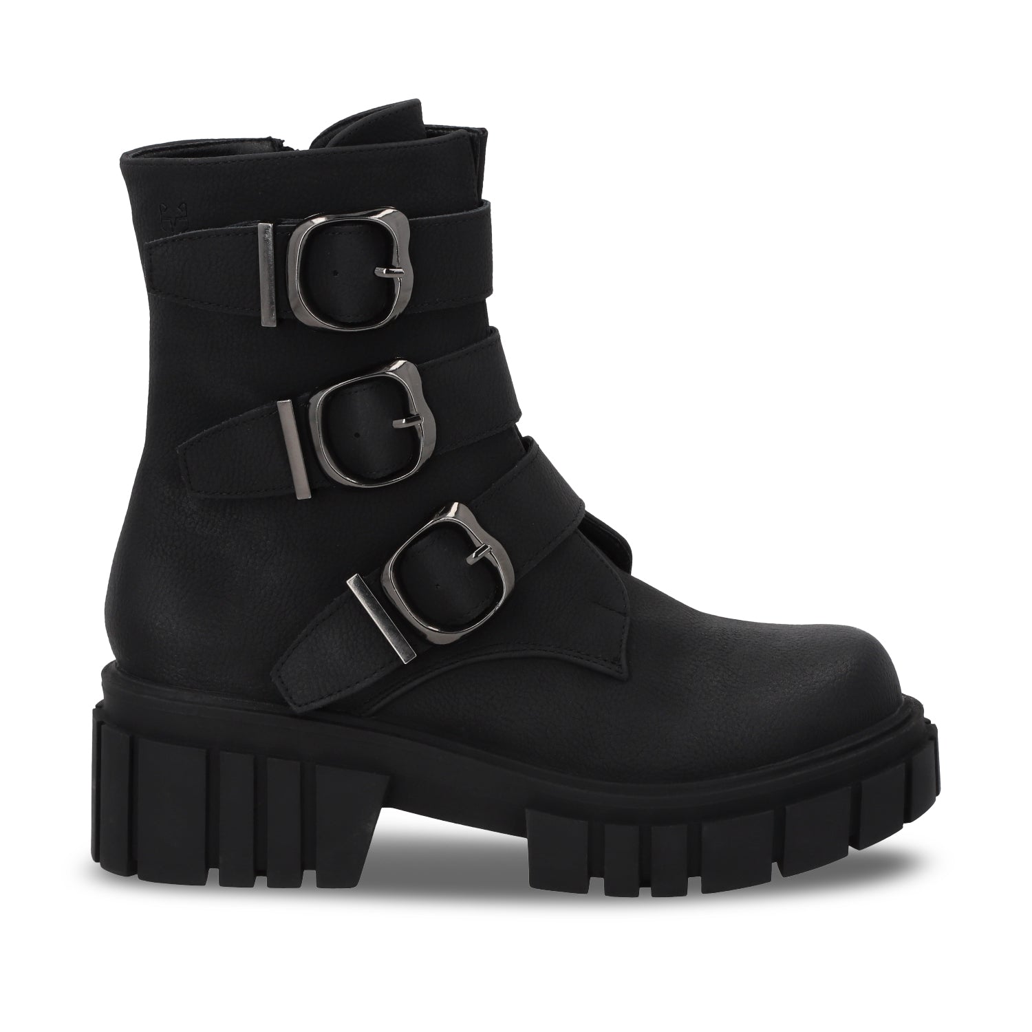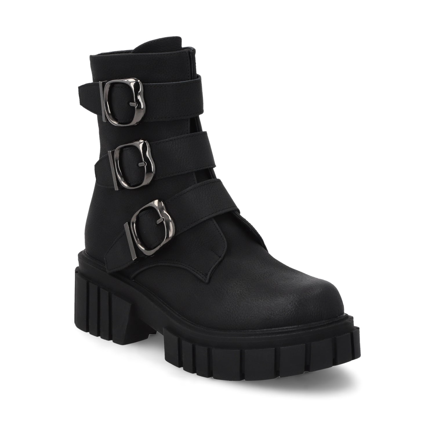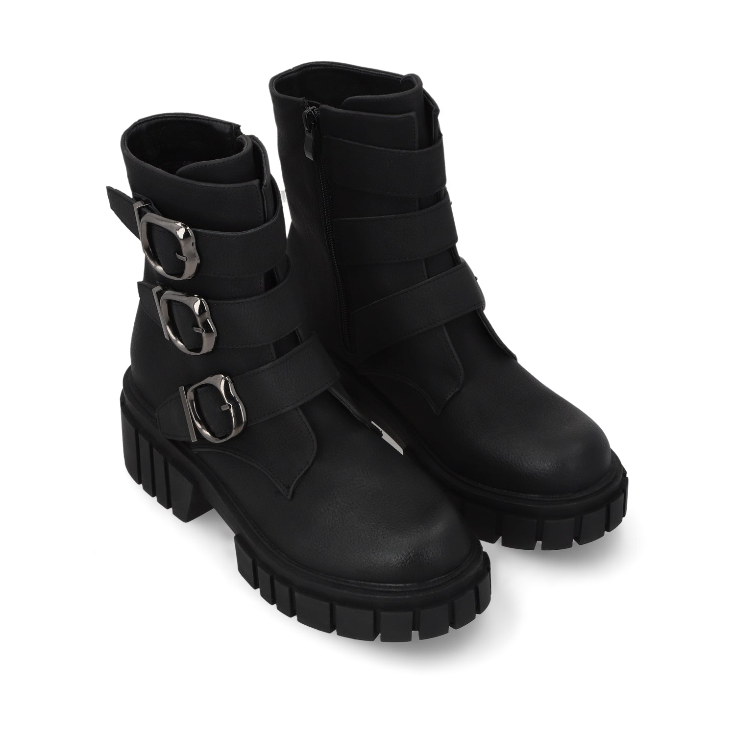 Marca tendencia esta temporada con estos botines en cuero negro que destacan por su plataforma imponente y hebillas metálicas súper cool. Su tacón cuadrado aporta estabilidad y estilo urbano para esos días que exigen un look impactante. El acabado en cuero suave, sumado a los detalles metálicos, elevan al máximo cualquier outfit casual.