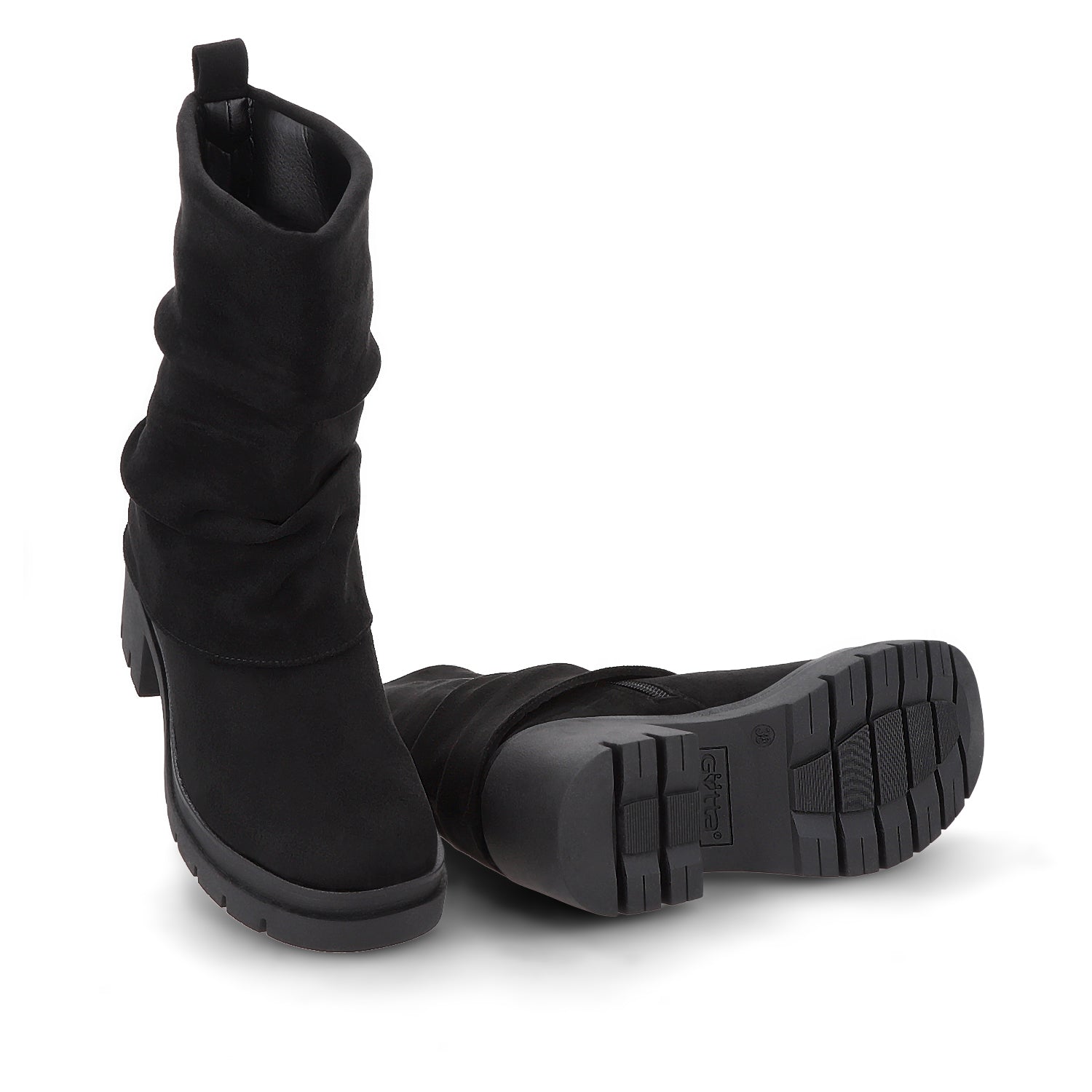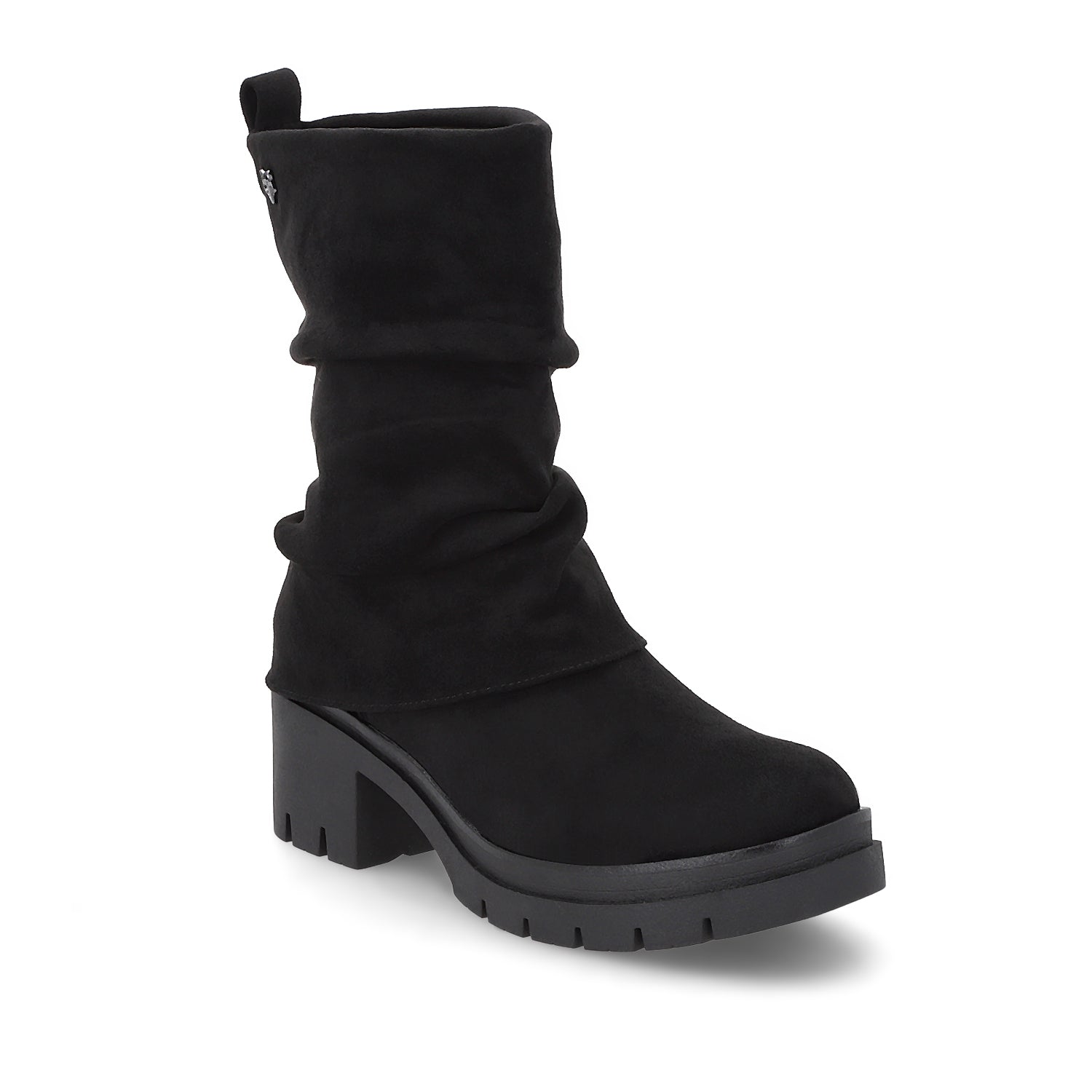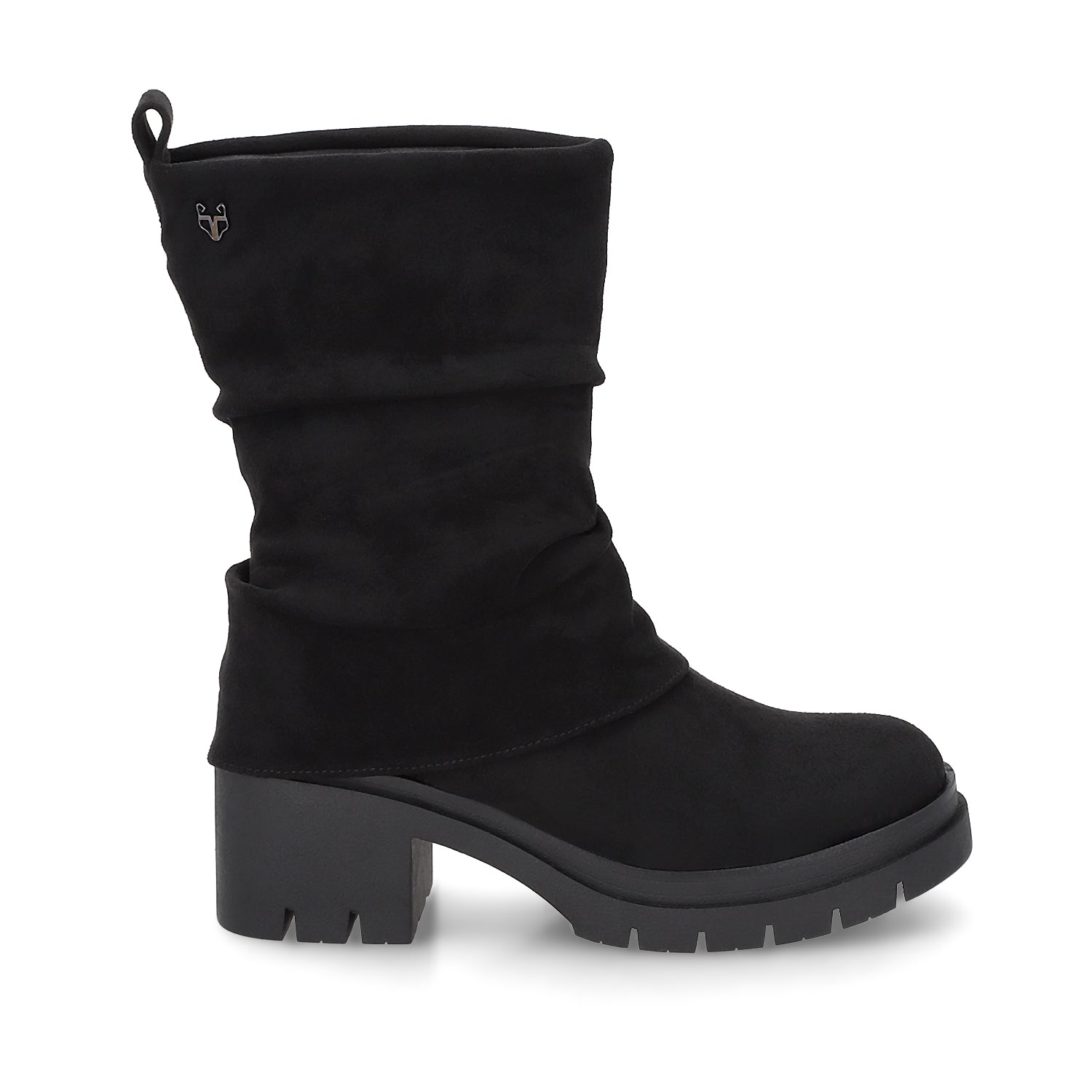 Este botín negro de gamuza es la combinación perfecta de comodidad y estilo. Su diseño con plataforma y taco cuadrado brinda altura sin renunciar al confort, permitiendo un ajuste estable para el día a día. Su textura en gamuza y el efecto arrugado en la caña lo convierten en un modelo tendencia que aporta un toque sofisticado y moderno a cualquier look urbano.