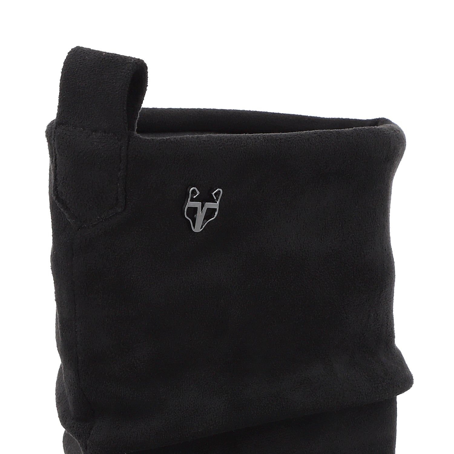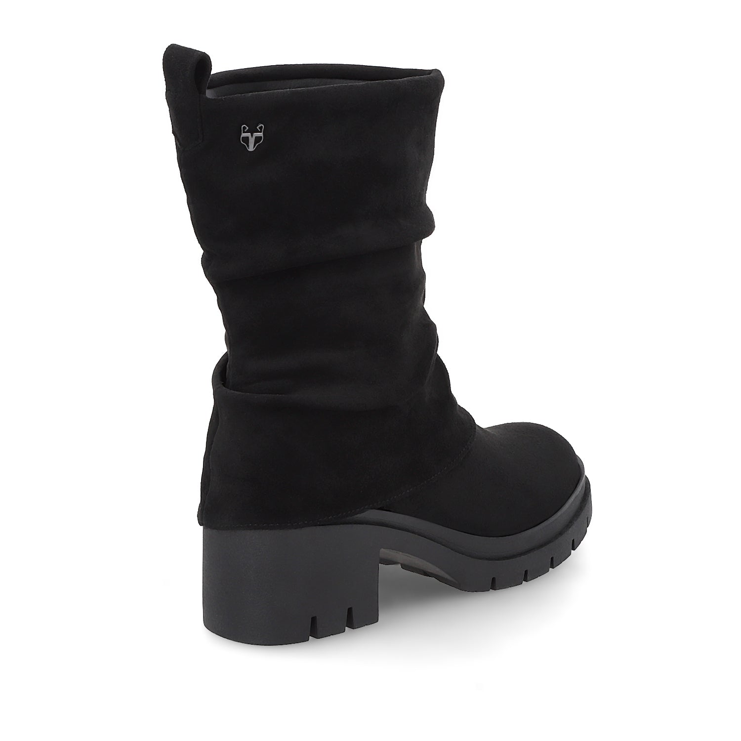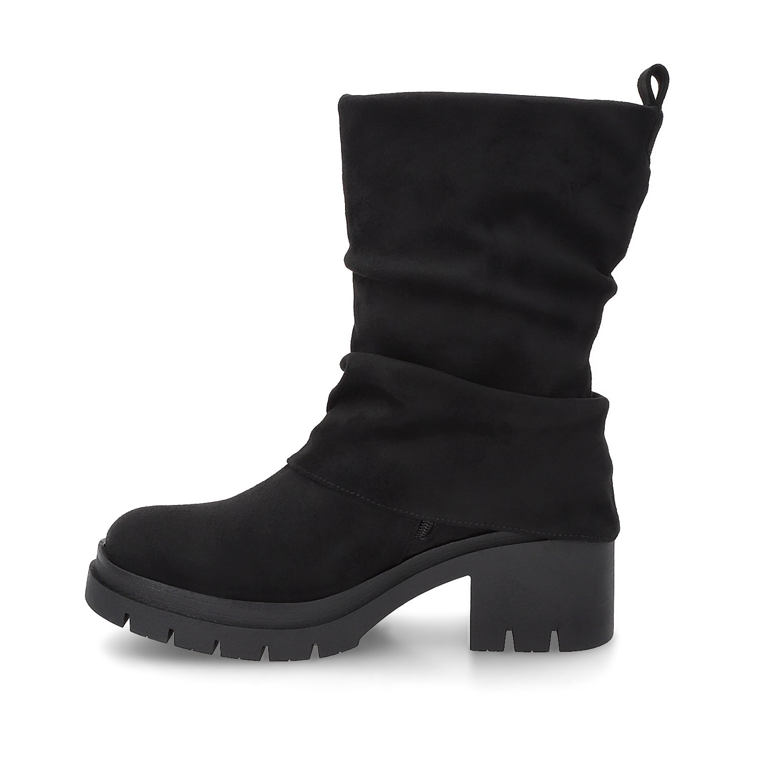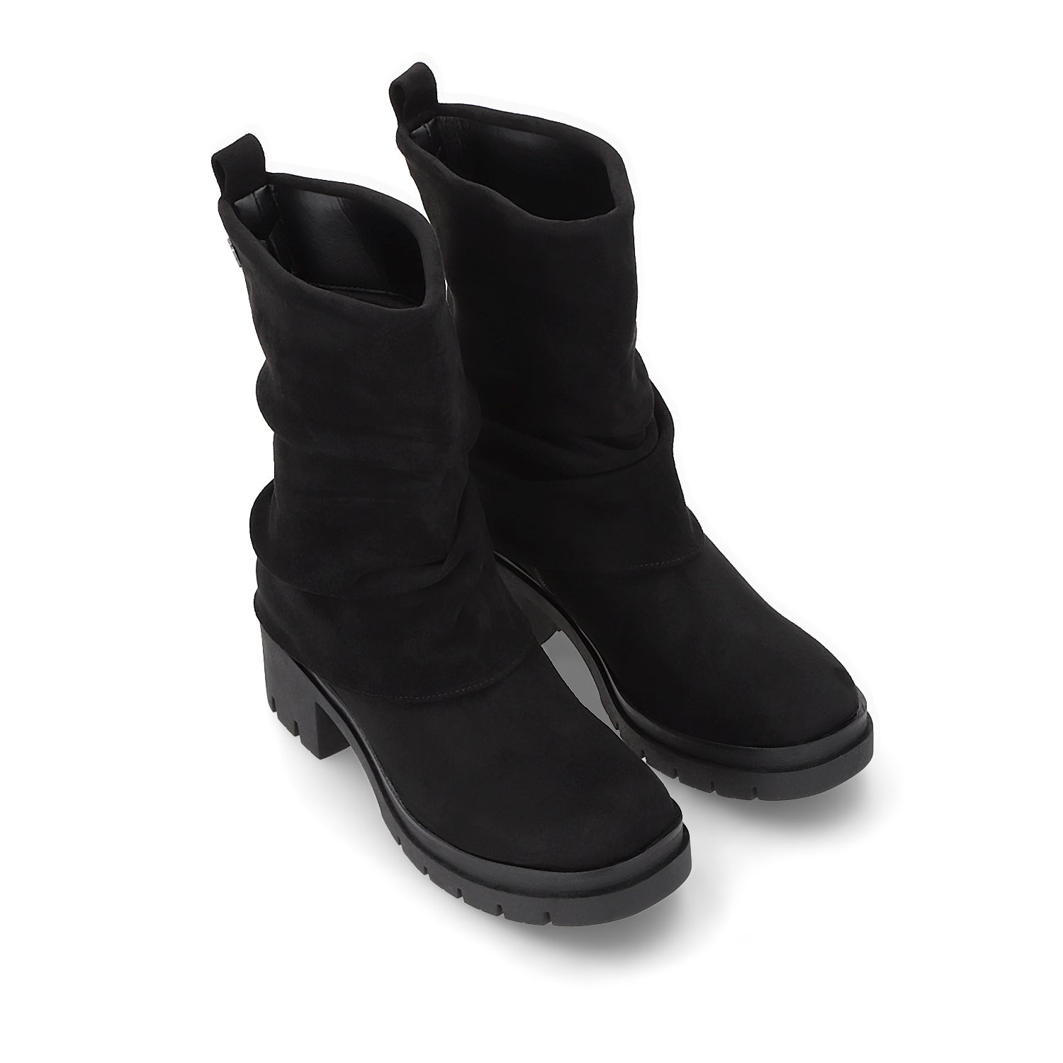 Este botín negro de gamuza es la combinación perfecta de comodidad y estilo. Su diseño con plataforma y taco cuadrado brinda altura sin renunciar al confort, permitiendo un ajuste estable para el día a día. Su textura en gamuza y el efecto arrugado en la caña lo convierten en un modelo tendencia que aporta un toque sofisticado y moderno a cualquier look urbano.