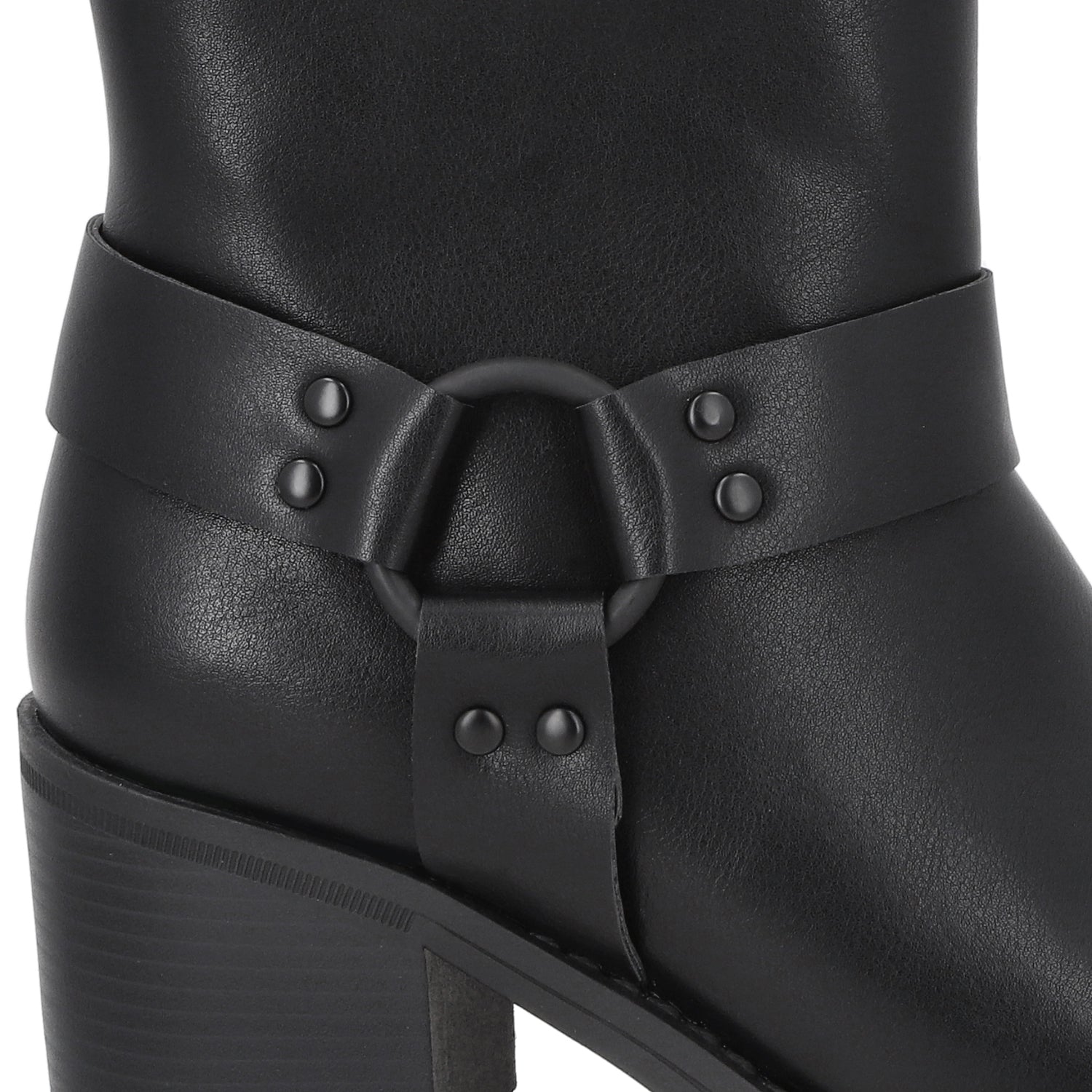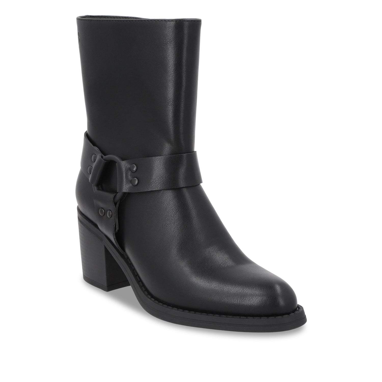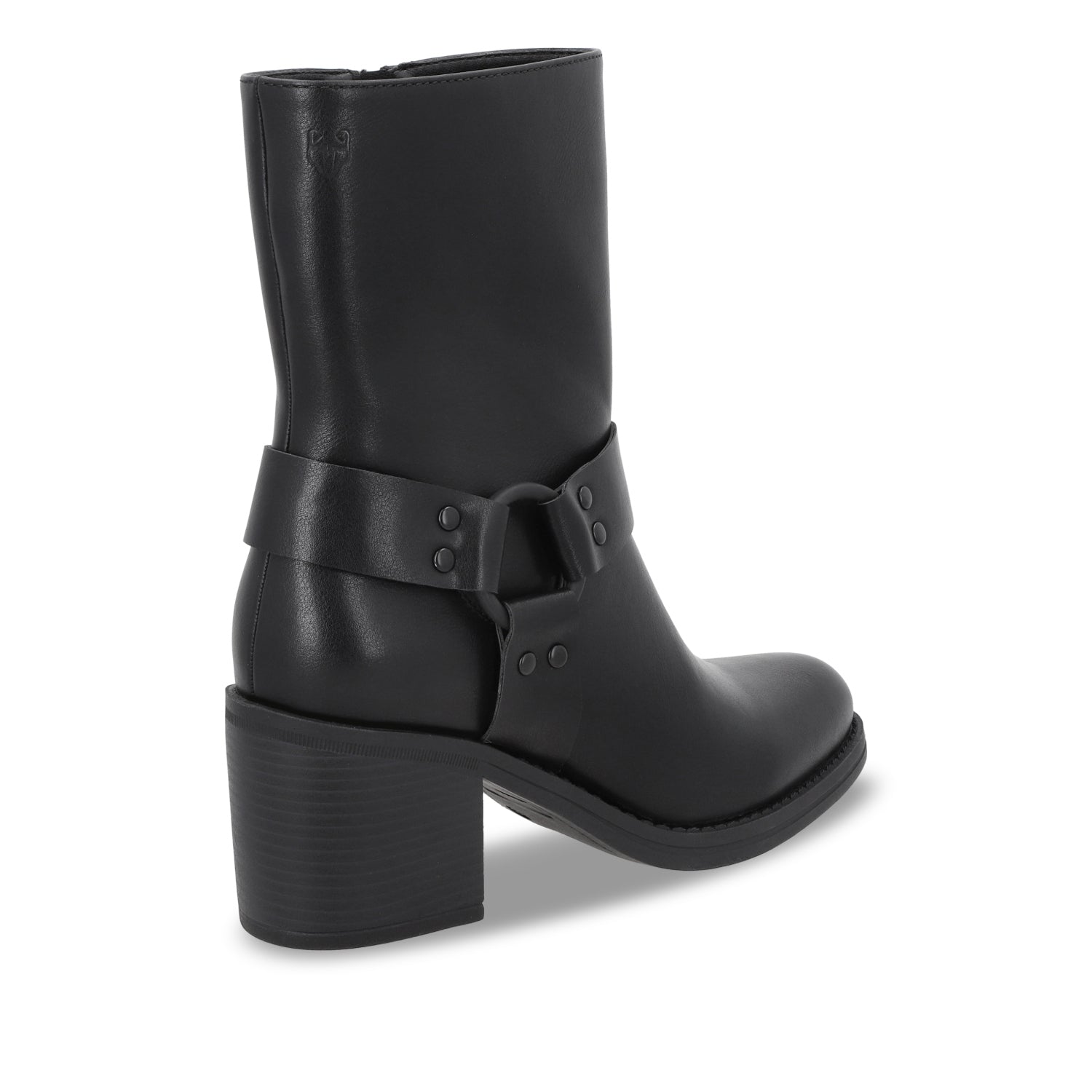 Este botín negro de apariencia cuero es el complemento ideal para un look moderno y sofisticado, perfecto para el día a día o para ocasiones más especiales. Su tacón medio proporciona estabilidad y comodidad, permitiéndote caminar con seguridad sin sacrificar estilo, mientras que su punta redonda le da un toque atemporal y versátil.