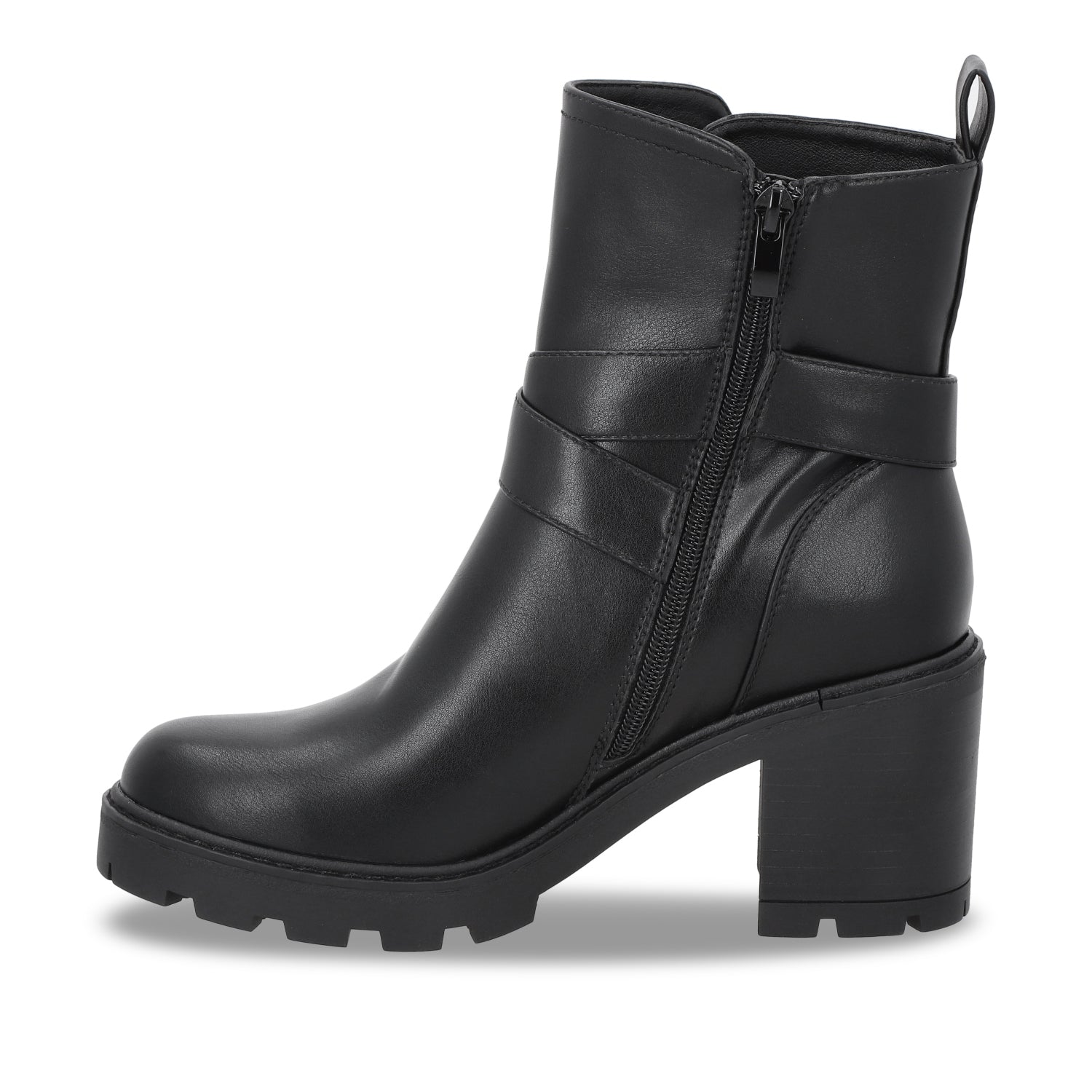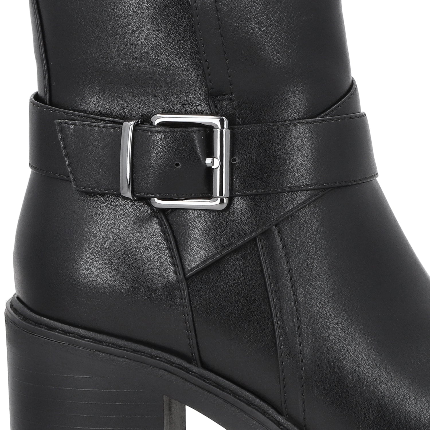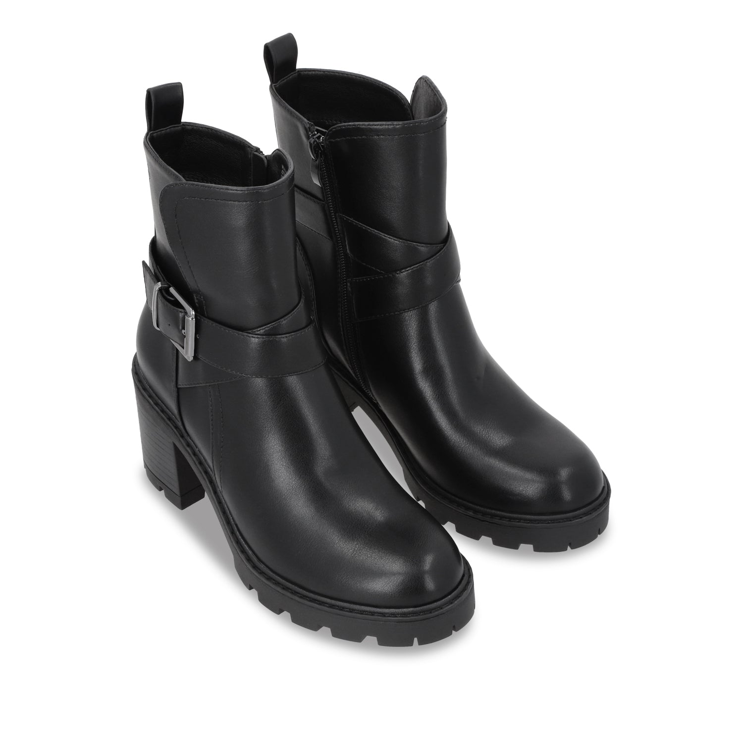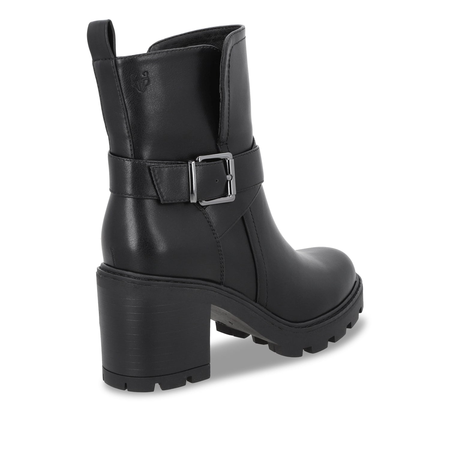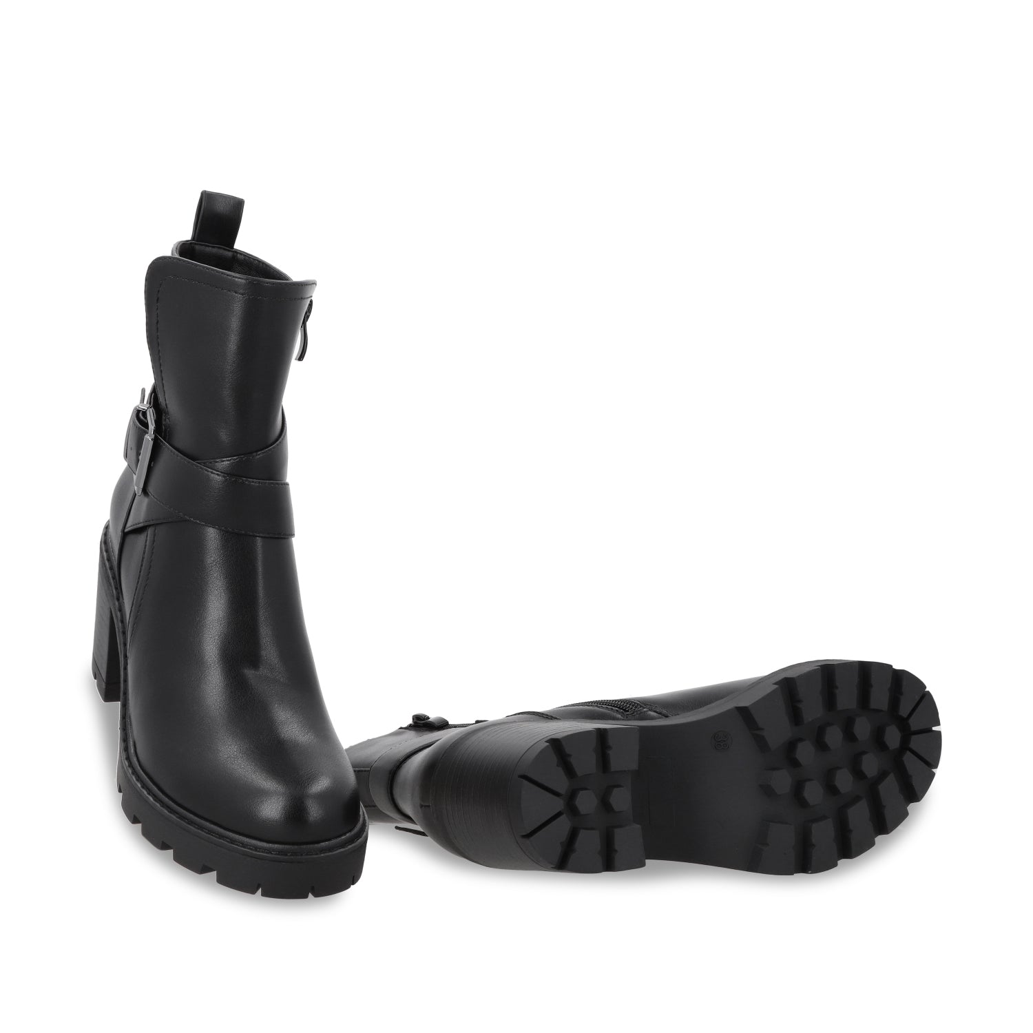Este botín negro de apariencia cuero con plataforma y tacón cuadrado es el equilibrio perfecto entre sofisticación y un toque rebelde, ideal para quienes buscan un calzado con personalidad. Su tacón estable y plataforma gruesa brindan altura y comodidad, permitiéndote caminar con seguridad sin renunciar al estilo.
