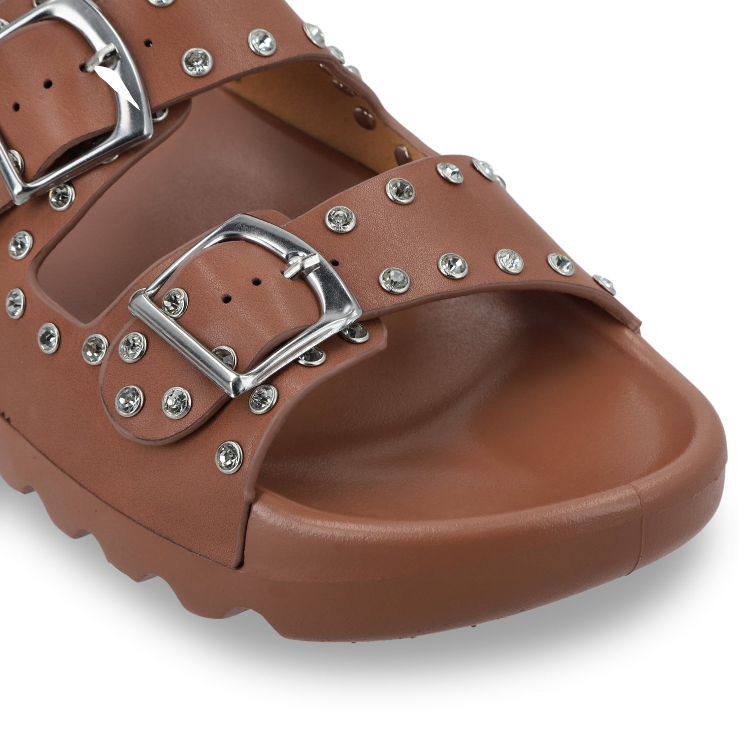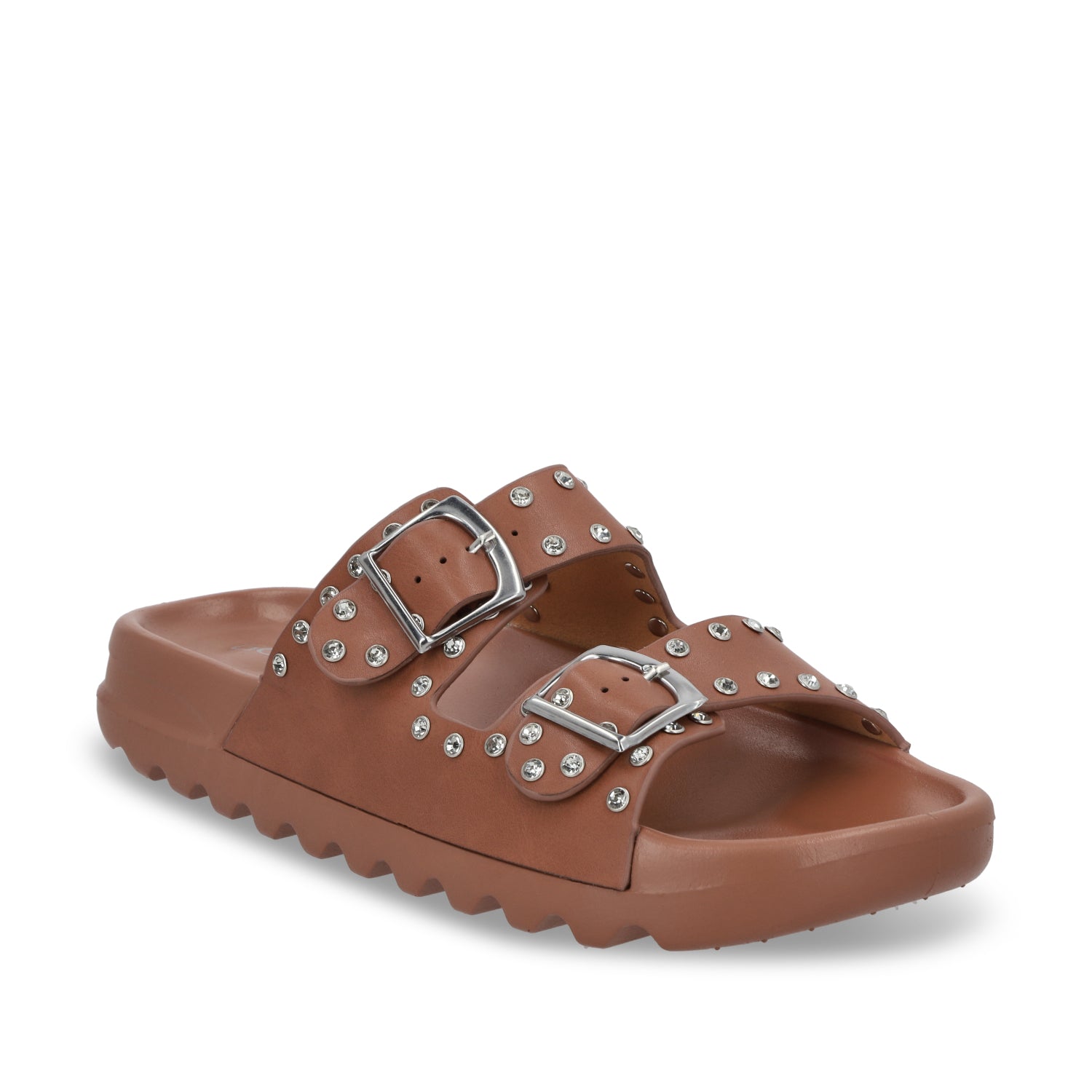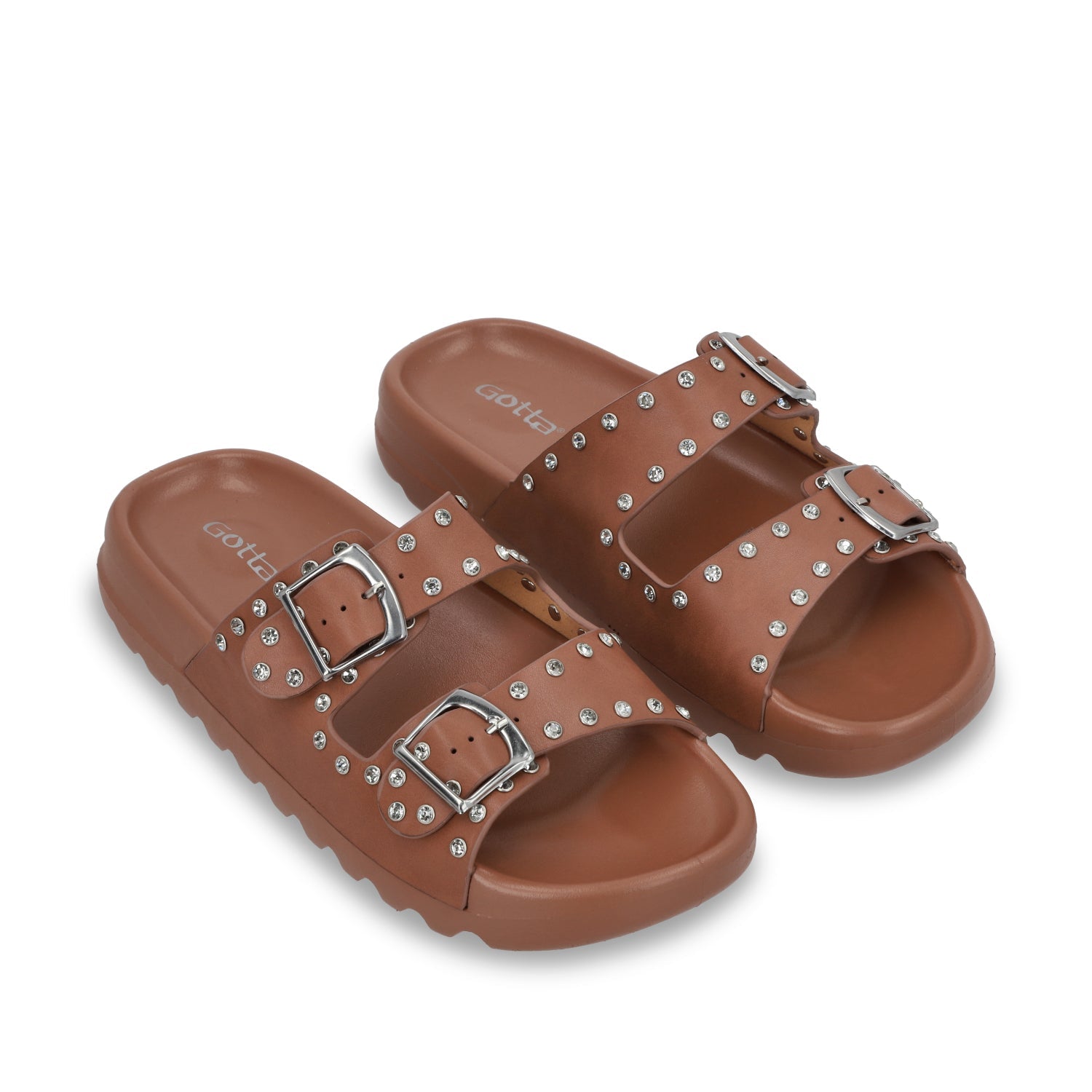 Elegancia y simplicidad en una sandalia plana color café. Perfectas para un look casual y desenfadado. El complemento ideal para tus atuendos de temporada.